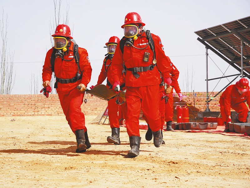 演练队员抢救“中毒”人员撤离现场 3月25日,采油三厂五里湾二区开展一季度井控演练暨标准化现场观摩活动。